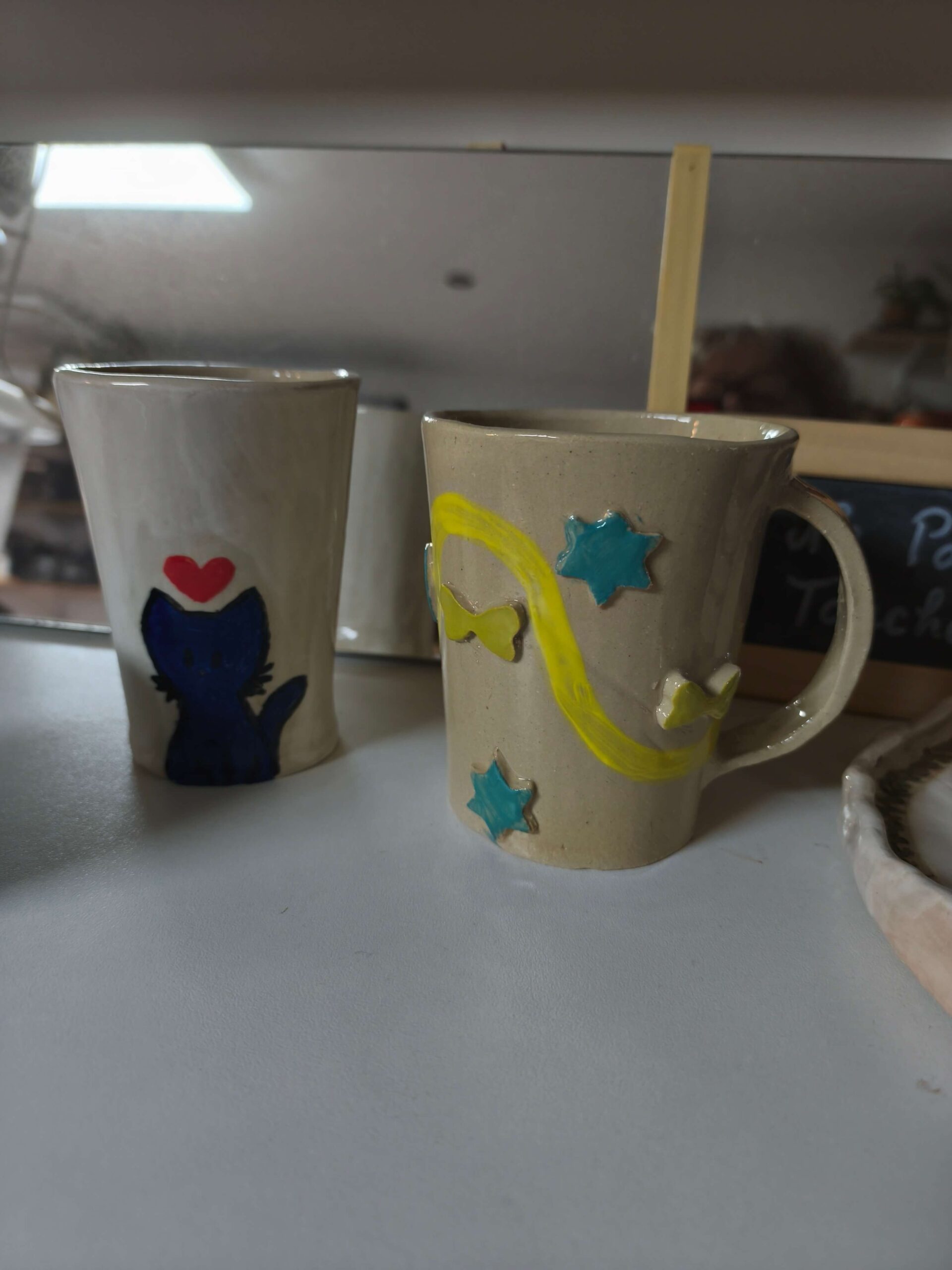 A l’atelier vous trouverez la terre, le matériel et les matières pour les décors (émail, engobes). Je m’occupe des cuissons et vous récupérez vos créations finalisées.